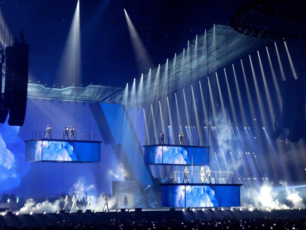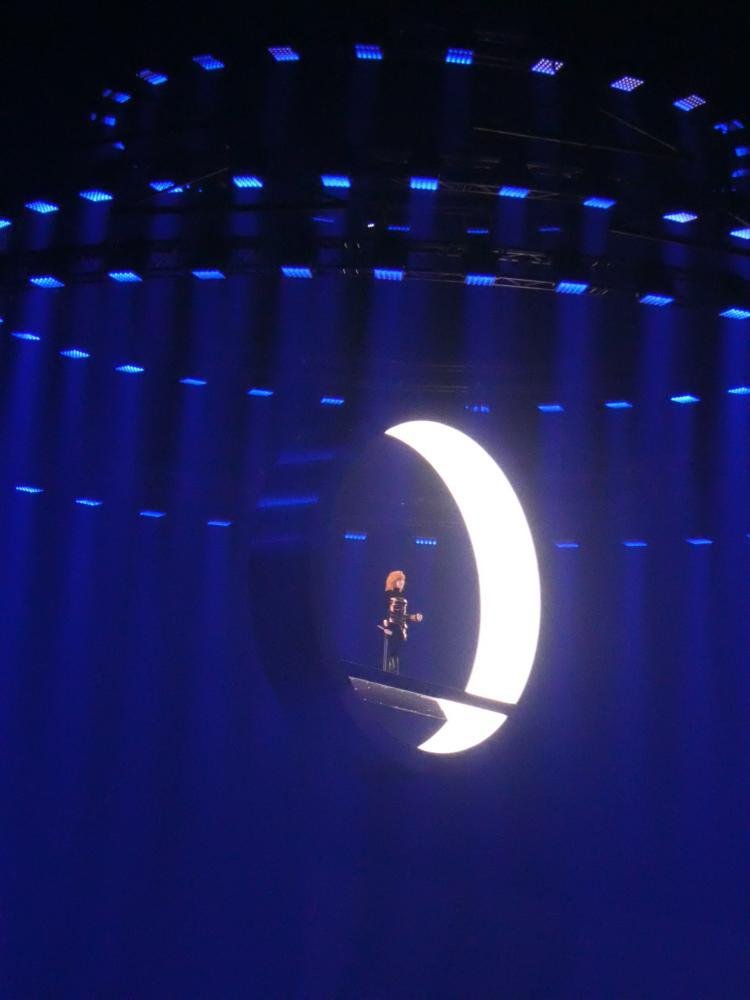Der Manager, Thierry Suc, hatte im April "un show démentiel", was man mit "eine verrückte Show" übersetzen könnte, versprochen, eine Show, wie man sie in Europa so noch nicht gesehen hat. Und er hat nicht einmal übertrieben. Eine vergleichbare Bühnenshow habe ich bisher höchstens bei U2 oder Roger Waters erlebt. Zum zweiten Mal in ihrer Karriere hat sich Mylène Farmer entschieden, nicht auf Tour zu gehen, sondern stattdessen an einem festen Ort zu residieren, in diesem Fall in der La Defense Arena, in Nanterre bei Paris. Zu den initial sechs Terminen, die Mitte Oktober letzten Jahres in den Vorverkauf gingen, sind weitere drei Zusatzkonzerte gekommen, neun Termine mit jeweils etwa 27.000 Zuschauern. Schon vor Konzertbeginn fallen mehrere LED Leinwände auf, die von der Decke herabhängen, dazu eine große runde Konstruktion mit Scheinwerfen unter dem Dach und ein Catwalk, der von der Bühne bis in Hallenmitte führt. Alle diese Elemente sind mobil, die Ringe mit den Scheinwerfern werden während des Konzertes rauf- und runtergefahren, ebenso die Leinwände. Auch der Laufsteg verschwindet zunächst wieder nach dem spektakulären Intro, um zur Hälfte des Konzertes erneut ausgefahren zu werden. Während der Show zeigt sich, dass auch die Aufbauten auf der Bühne beweglich sind, mehrere Quader und weitere geometrische Elemente, die sich beliebig anordnen lassen, sogar an Seilen durch die Halle schweben und ein wenig an das Spiel Tangram erinnern. Auch die Band samt Schlagzeug und Keyboards kann je nach Bühnenbild hin- und hergefahren werden. Pünktlichkeit ist eine Tugend, die Mylène Farmer nicht auszeichnet. Offiziell beginnen die Konzerte um 20:00, aberan beiden Tagen geht es erst um 20:50 wirklich los. Die Scheinwerfer suchen die Hallendecke und Mylène schwebt in einem schmalen Hohlzylinder zu uns Sterblichen herab, der so angeleuchtet wird, dass es aussieht, als stehe sie auf der Mondsichel. Das Konzert beginnt mit "Interstellaires" und schon beim ersten Song fallen gleich mehrere Dinge auf - zunächst: Jean Paul Gaultier hat sich selbst übertroffen. Die Kostüme von Farmer sind sehr viel schlichter als bei ihren letzten Tourneen, fast komplett (bis auf den allerletzten Song) in schwarz oder schwarz-weiß gehalten. Der Sound ist für diese große Halle nahezu perfekt. Und die Show ist so komplett überwältigend, dass man kaum weiß, wo man hinschauen soll. Den Bühnenhintergrund bildet eine weiter LED Leinwand, die zusätzlich zu den genannten Elementen weiteren visuellen Input liefert. Und die Setlist? Ist großartig! Im Prinzip könnte Mylène mit ihren französischen #1 Singles den kompletten Abend füllen (sie hat bisher 18 davon zu bieten), aber das macht sie glücklicherweise nicht.