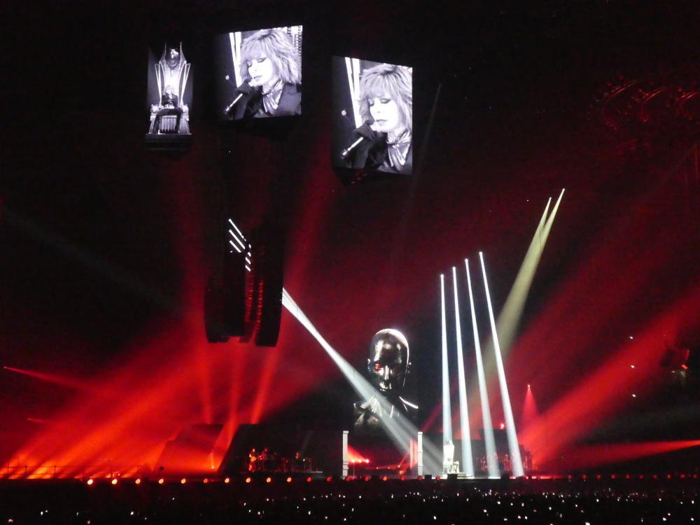 Beim zweiten Anschauen ist die Show nicht weniger spektakulär, aber es gelingt dann doch, mehr auf Einzelheiten zu achten, speziell auch auf die Videos, die den oft melancholischen oder düsteren Inhalt von Farmers Texten unterstreichen. Die Videoclips von Laurent Boutonnat waren in den 80er Jahren ein wichtiger Faktor von Farmers künstlerischer Identität; noch vor ihren ersten Konzerten konnte sie dort ihre Vorstellungen umsetzen. Boutonnat und Farmer haben in den letzten 10 Jahren nur noch ein Album zusammen geschrieben, aber der 58jährige hat das Konzept für die aktuellen Shows mit der Künstlerin zusammen entwickelt. "California" zeigt jetzt kein L.A. der Gegenwart mehr, sondern eine Dystopie, die stark an die Kulisse von "Blade Runner" erinnert. Zu Beginn von "Désenchantée" verwandelt sich die Bühne in eine Eislandschaft, was zumindest beim Rezensenten von Le Figaro Assoziationen an "Game of Thrones" geweckt hat: "Winter is coming". Andere Kommentare im Netz sehen beim Bühnenbild eine Verbindung zur 1974er "Diamond Dogs" Tour von Bowie. Welche persönlichen Eindrücke man gewinnt - insgesamt sind die Installationen eher düster. Fröhliche Bilder gibt es nicht zu sehen. Aufgrund des enormen technischen Aufwandes ist auch die Wahrscheinlichkeit, dass sich bei den restlichen Terminen noch etwas an der Setliste ändert, gering ( würde ich sagen). Wie schön, dass trotzdem nicht alles perfekt funktioniert: Am zweiten Abend stimmte Farmer statt „Rêver“ zunächst (noch einmal) "Innamoramento" an und musste darüber so lachen, dass sie erst einmal für eine Minute die Fassung verloren hat.