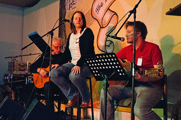 Nochmal zum Hintergrund - da Anthony Phillips selbst seit Jahrzehnten (aus den bekannten Gründen) nicht auftritt, gab es an dem Wochenende rund 20 MusikerInnen und Gruppen, die jeweils 3-4 Lieder von ihm live spielten. Und bis auf 2-3 Berufsmusiker unter ihnen waren alles im Grunde blutige Amateure, Liebhaber und maximal Semi-Profis. Allein das muß man sich mal vorstellen... da sind sie selbst (oft auch schon Jahrzehnte lang) Fans von diesem Musiker und Komponisten, und dann gehen sie auf die Bühne und spielen ihm selbst seine eigene Lieder vor... und Phillips, der noch nie so eine Convention besucht hatte, sitzt davor und hört ihnen zu...