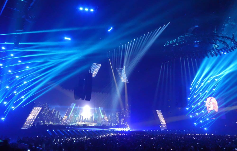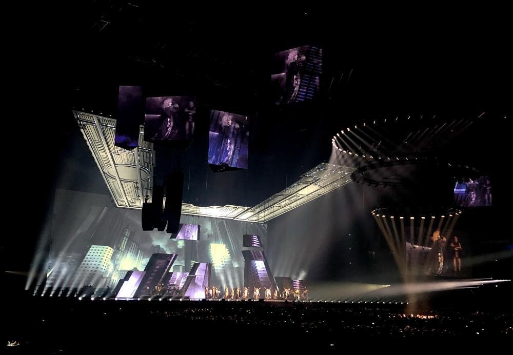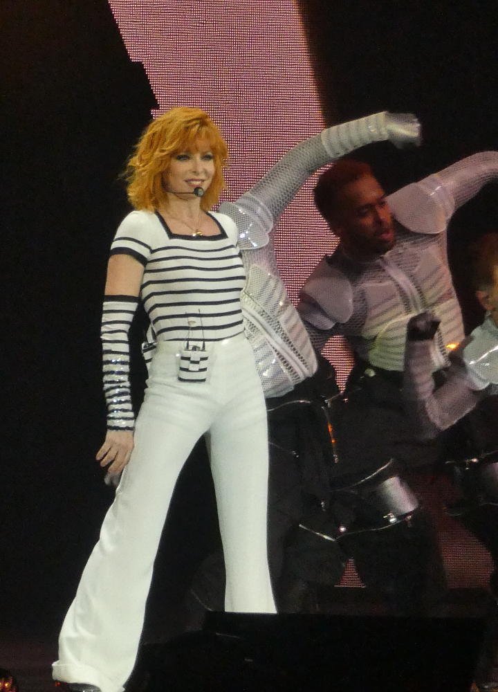 Der Manager, Thierry Suc, hatte im April "un show démentiel", was man mit "eine verrückte Show" übersetzen könnte, versprochen, eine Show, wie man sie in Europa so noch nicht gesehen hat. Und er hat nicht einmal übertrieben. Eine vergleichbare Bühnenshow habe ich bisher höchstens bei U2 oder Roger Waters erlebt. Zum zweiten Mal in ihrer Karriere hat sich Mylène Farmer entschieden, nicht auf Tour zu gehen, sondern stattdessen an einem festen Ort zu residieren, in diesem Fall in der La Defense Arena, in Nanterre bei Paris. Zu den initial sechs Terminen, die Mitte Oktober letzten Jahres in den Vorverkauf gingen, sind weitere drei Zusatzkonzerte gekommen, neun Termine mit jeweils etwa 27.000 Zuschauern. Schon vor Konzertbeginn fallen mehrere LED Leinwände auf, die von der Decke herabhängen, dazu eine große runde Konstruktion mit Scheinwerfen unter dem Dach und ein Catwalk, der von der Bühne bis in Hallenmitte führt. Alle diese Elemente sind mobil, die Ringe mit den Scheinwerfern werden während des Konzertes rauf- und runtergefahren, ebenso die Leinwände. Auch der Laufsteg verschwindet zunächst wieder nach dem spektakulären Intro, um zur Hälfte des Konzertes erneut ausgefahren zu werden. Während der Show zeigt sich, dass auch die Aufbauten auf der Bühne beweglich sind, mehrere Quader und weitere geometrische Elemente, die sich beliebig anordnen lassen, sogar an Seilen durch die Halle schweben und ein wenig an das Spiel Tangram erinnern. Auch die Band samt Schlagzeug und Keyboards kann je nach Bühnenbild hin- und hergefahren werden. Pünktlichkeit ist eine Tugend, die Mylène Farmer nicht auszeichnet. Offiziell beginnen die Konzerte um 20:00, aberan beiden Tagen geht es erst um 20:50 wirklich los. Die Scheinwerfer suchen die Hallendecke und Mylène schwebt in einem schmalen Hohlzylinder zu uns Sterblichen herab, der so angeleuchtet wird, dass es aussieht, als stehe sie auf der Mondsichel. Das Konzert beginnt mit "Interstellaires" und schon beim ersten Song fallen gleich mehrere Dinge auf - zunächst: Jean Paul Gaultier hat sich selbst übertroffen. Die Kostüme von Farmer sind sehr viel schlichter als bei ihren letzten Tourneen, fast komplett (bis auf den allerletzten Song) in schwarz oder schwarz-weiß gehalten. Der Sound ist für diese große Halle nahezu perfekt. Und die Show ist so komplett überwältigend, dass man kaum weiß, wo man hinschauen soll. Den Bühnenhintergrund bildet eine weiter LED Leinwand, die zusätzlich zu den genannten Elementen weiteren visuellen Input liefert. Und die Setlist? Ist großartig! Im Prinzip könnte Mylène mit ihren französischen #1 Singles den kompletten Abend füllen (sie hat bisher 18 davon zu bieten), aber das macht sie glücklicherweise nicht.
