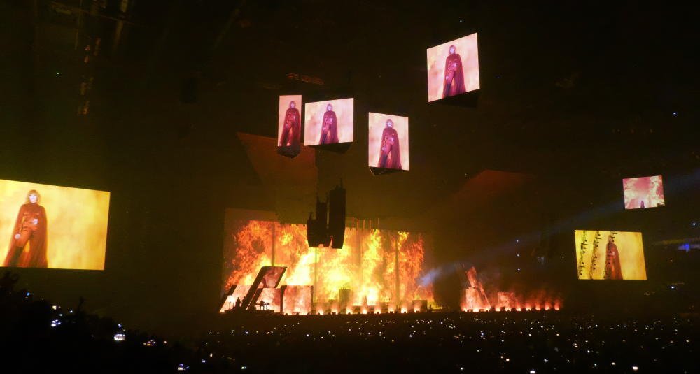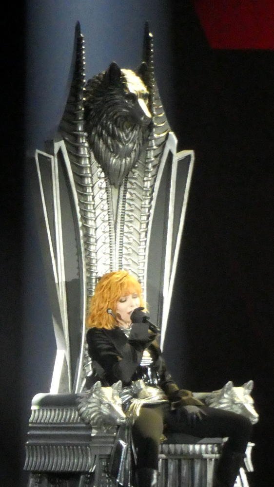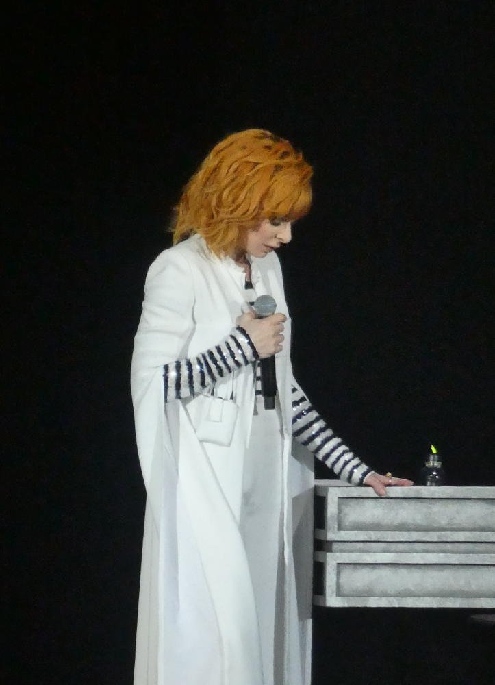 Beim zweiten Anschauen ist die Show nicht weniger spektakulär, aber es gelingt dann doch, mehr auf Einzelheiten zu achten, speziell auch auf die Videos, die den oft melancholischen oder düsteren Inhalt von Farmers Texten unterstreichen. Die Videoclips von Laurent Boutonnat waren in den 80er Jahren ein wichtiger Faktor von Farmers künstlerischer Identität; noch vor ihren ersten Konzerten konnte sie dort ihre Vorstellungen umsetzen. Boutonnat und Farmer haben in den letzten 10 Jahren nur noch ein Album zusammen geschrieben, aber der 58jährige hat das Konzept für die aktuellen Shows mit der Künstlerin zusammen entwickelt. "California" zeigt jetzt kein L.A. der Gegenwart mehr, sondern eine Dystopie, die stark an die Kulisse von "Blade Runner" erinnert. Zu Beginn von "Désenchantée" verwandelt sich die Bühne in eine Eislandschaft, was zumindest beim Rezensenten von Le Figaro Assoziationen an "Game of Thrones" geweckt hat: "Winter is coming". Andere Kommentare im Netz sehen beim Bühnenbild eine Verbindung zur 1974er "Diamond Dogs" Tour von Bowie. Welche persönlichen Eindrücke man gewinnt - insgesamt sind die Installationen eher düster. Fröhliche Bilder gibt es nicht zu sehen. Aufgrund des enormen technischen Aufwandes ist auch die Wahrscheinlichkeit, dass sich bei den restlichen Terminen noch etwas an der Setliste ändert, gering ( würde ich sagen). Wie schön, dass trotzdem nicht alles perfekt funktioniert: Am zweiten Abend stimmte Farmer statt „Rêver“ zunächst (noch einmal) "Innamoramento" an und musste darüber so lachen, dass sie erst einmal für eine Minute die Fassung verloren hat.