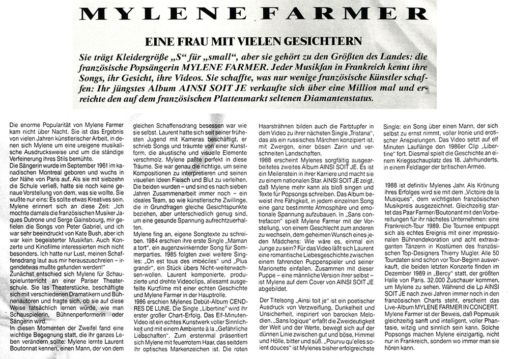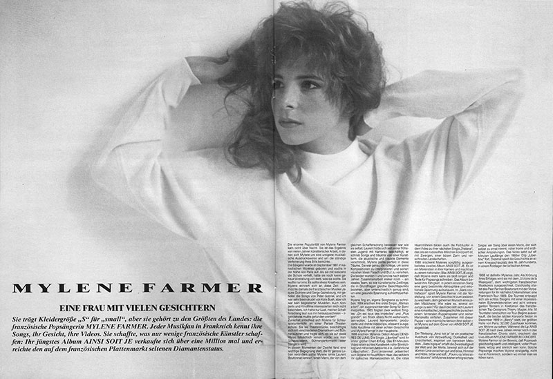 Und dieses Exemplar erwies sich als ausgesprochen bizarr - auf dem Cover ein riesiges Farbfoto von Marianne Rosenstiehl aus der "En Concert" Serie, und in der Inhaltsangabe der Name "Mylène Farmer" neben drei anderen Themen.